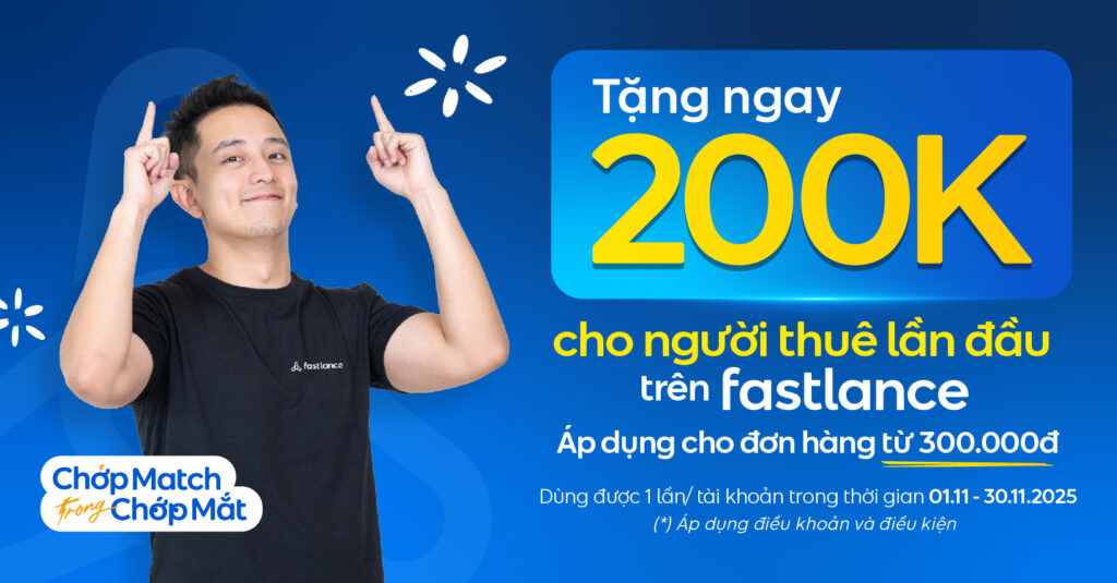 Bạn đang tìm freelancer để hỗ trợ công việc nhưng chưa biết bắt đầu từ đâu? Đây chính là thời điểm lý tưởng để bạn trải nghiệm Fastlance – nền tảng kết nối freelancer hàng đầu Đông Nam Á – với ưu đãi độc quyền: giảm ngay 200.000đ cho khách thuê lần đầu cho đơn hàng từ 300.000đ!
